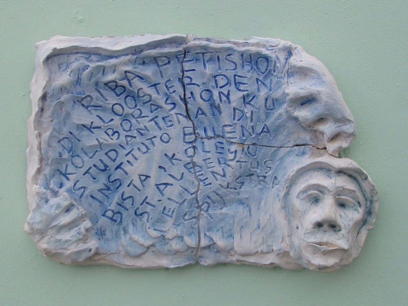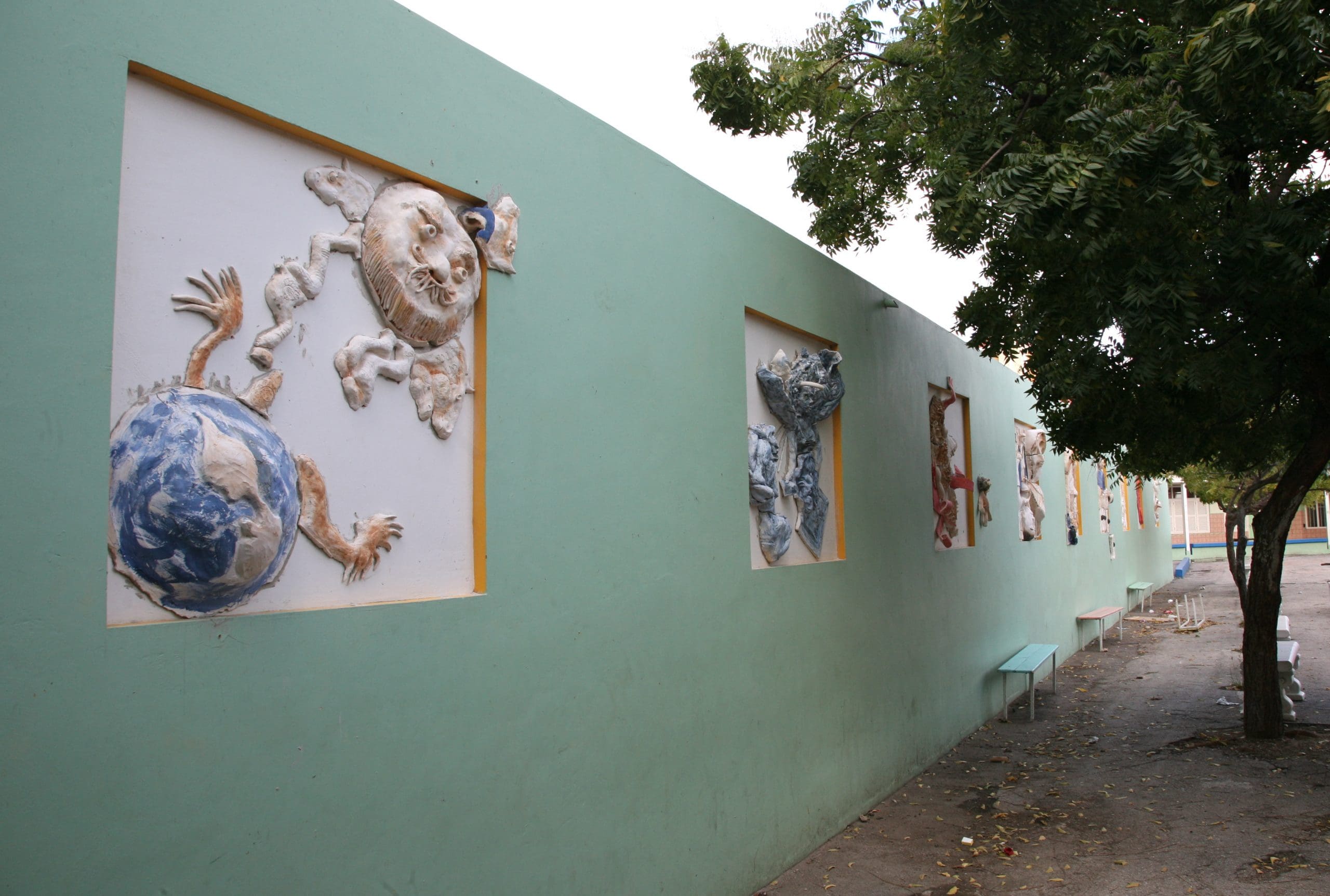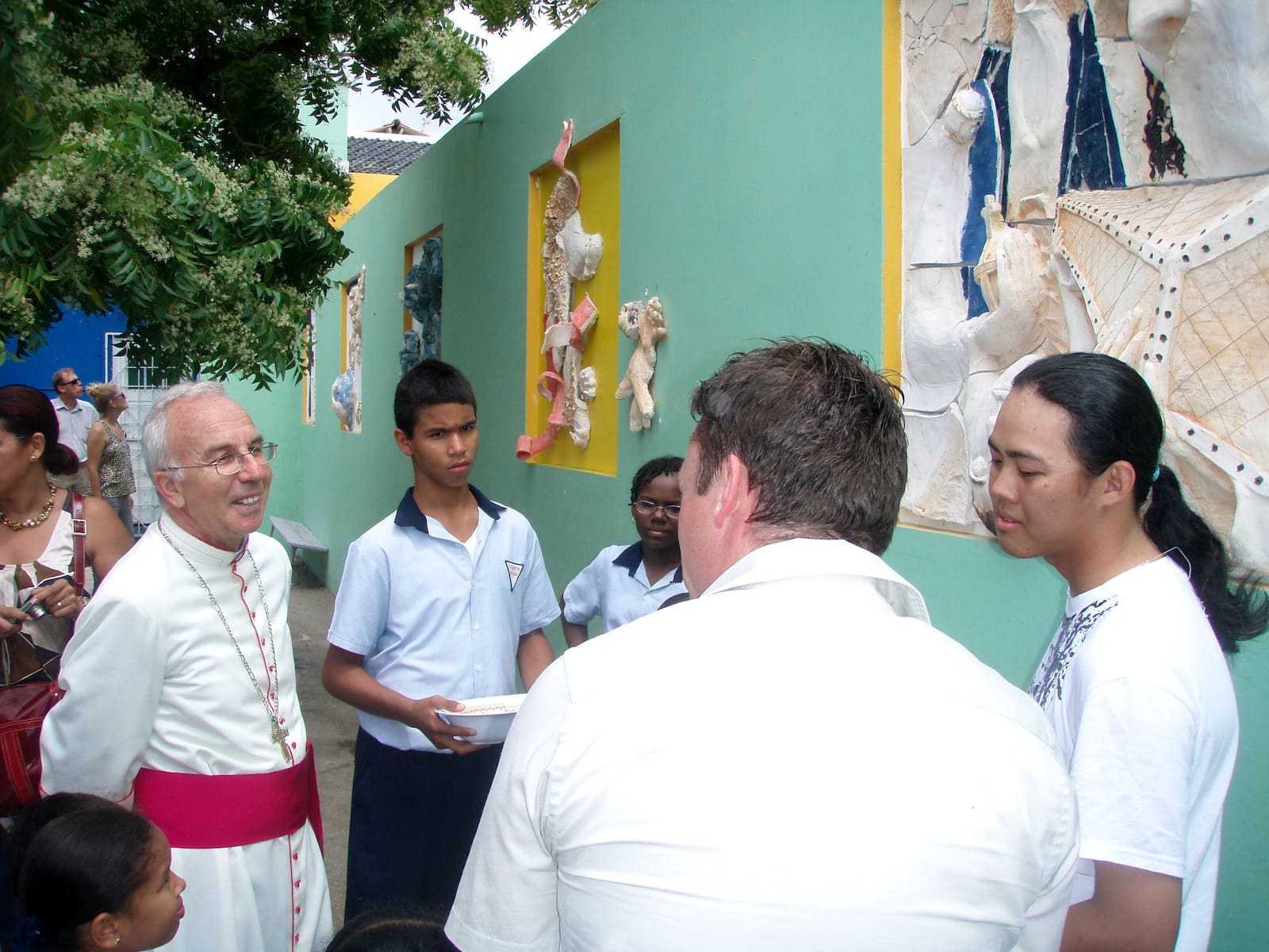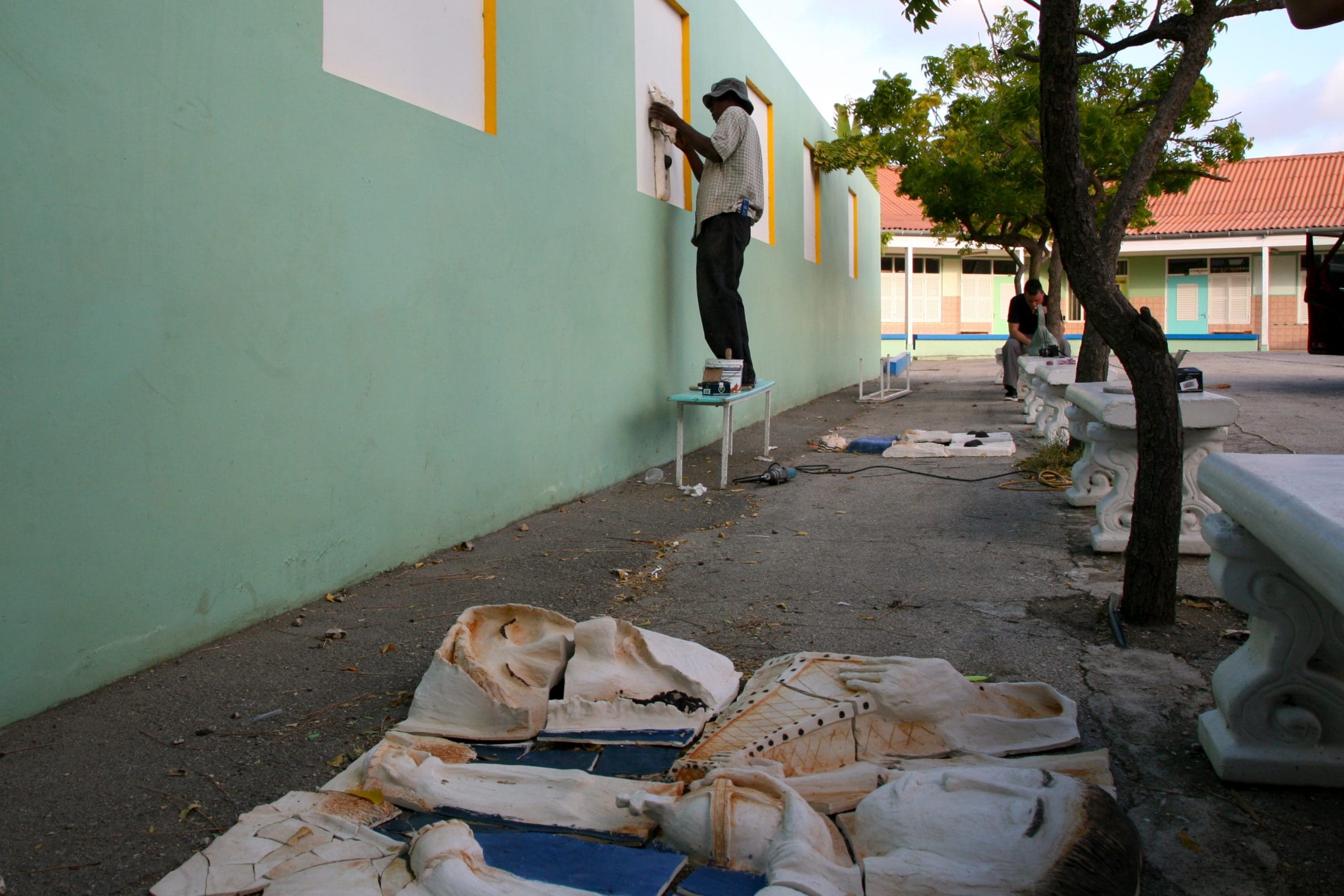 December 2010 I gave classes at Instituto Bueno Bista, the pre-art academy of Curacao. Their 15 students and 2 apprentices each made a mural of 1 x 1 meter; scenes of the bible in their own interpretation. Two afternoons 30 school kids (grade 7th and 8th) also participated in the project. After drying and firing we installed the murals at the St. Albertus College in Pietermaai, as part of a renovation project by architect Lyongo Juliana. Content development was under guidance of artists (and founders of IBB) David Bade and Tirzo Martha. The translation from 2D into ceramic murals happened under my guidance. After the whole installation process was finished, the murals were officially blessed by Bishop Secco during a gathering with all the school kids participating.