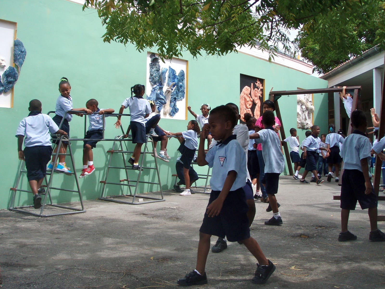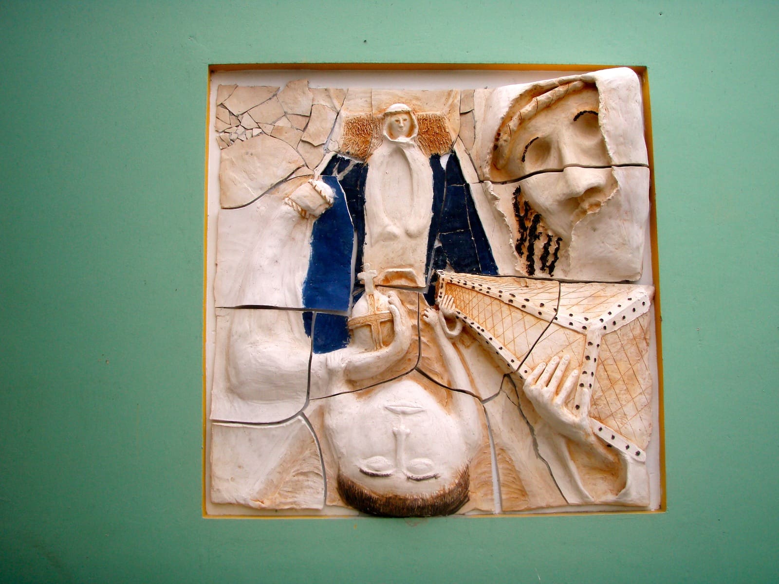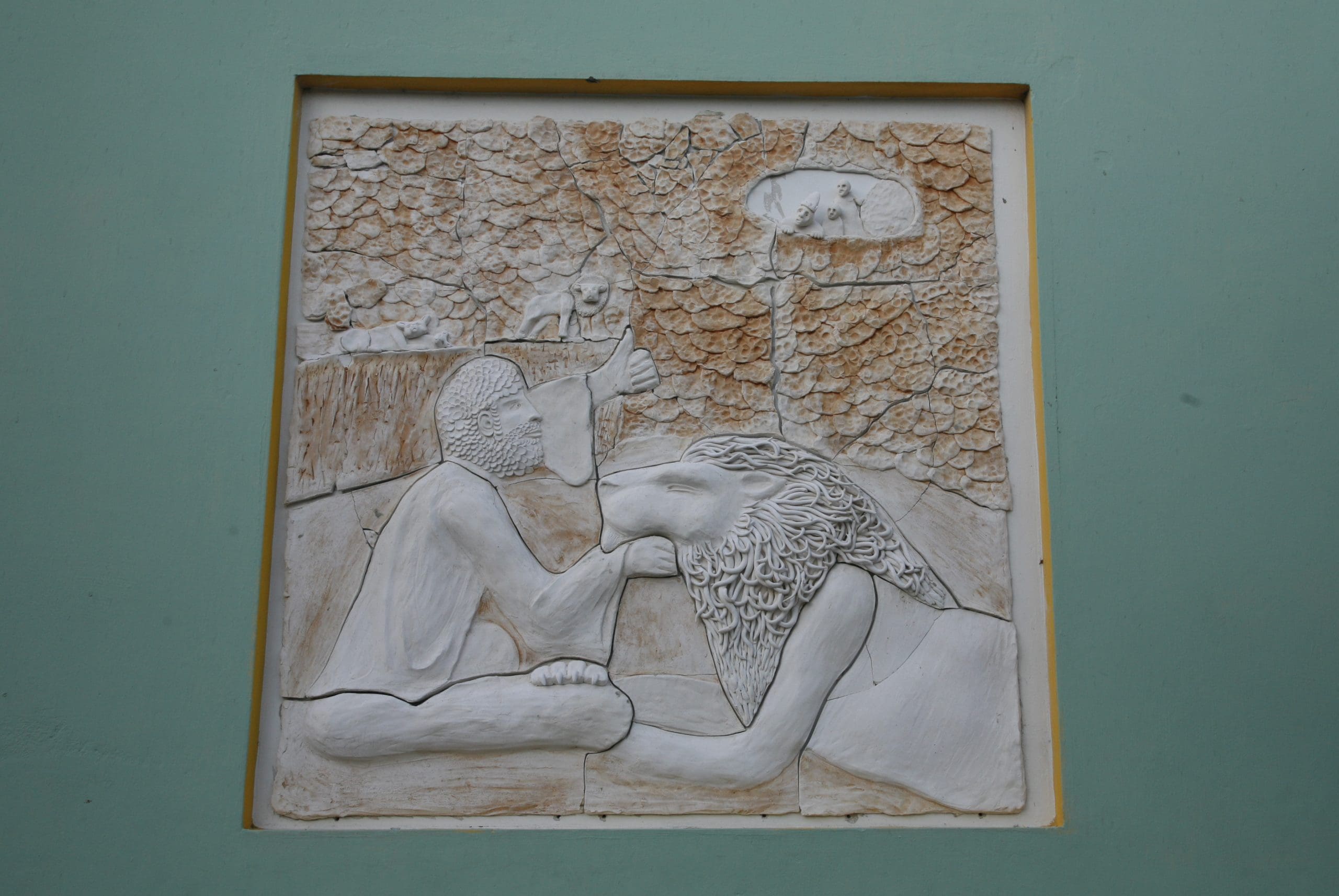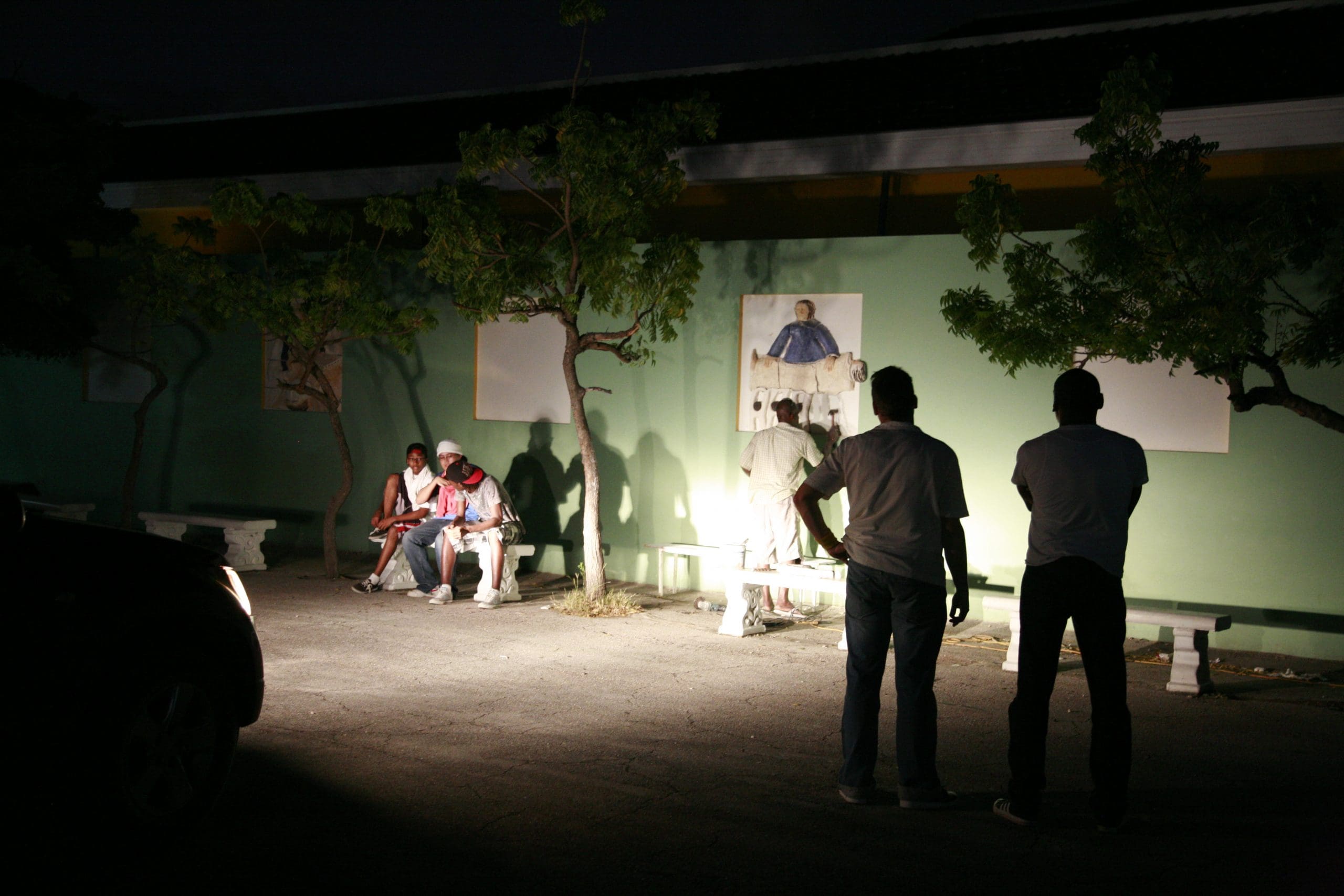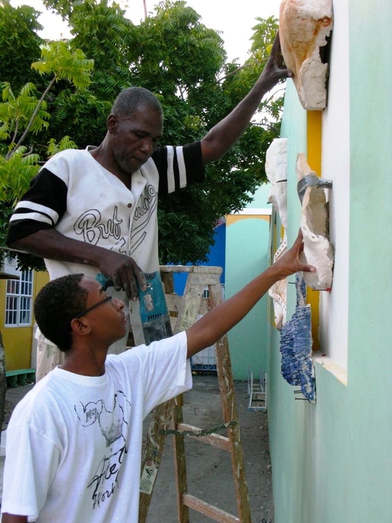 December 2010 I gave classes at Instituto Bueno Bista, the pre-art academy of Curacao. Their 15 students and 2 apprentices each made a mural of 1 x 1 meter; scenes of the bible in their own interpretation. Two afternoons 30 school kids (grade 7th and 8th) also participated in the project. After drying and firing we installed the murals at the St. Albertus College in Pietermaai, as part of a renovation project by architect Lyongo Juliana. Content development was under guidance of artists (and founders of IBB) David Bade and Tirzo Martha. The translation from 2D into ceramic murals happened under my guidance. After the whole installation process was finished, the murals were officially blessed by Bishop Secco during a gathering with all the school kids participating.